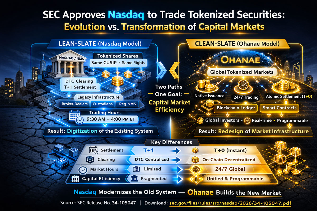 The U.S. Securities and Exchange Commission has approved Nasdaq's proposal to enable trading of securities in tokenized form. While widely seen as a breakthrough, the structure reveals a critical reality: tokenization is being integrated within the existing market system—not replacing it. Tokenized shares must remain fully fungible with traditional securities, settle through the Depository Trust Company (DTC), and operate under the same rules, timelines, and infrastructure. This is a meaningful step forward—but not a structural transformation. The implication is clear: the future of tokenized securities will not be defined by digitization alone, but by the emergence of new market infrastructure designed for blockchain-native assets.